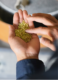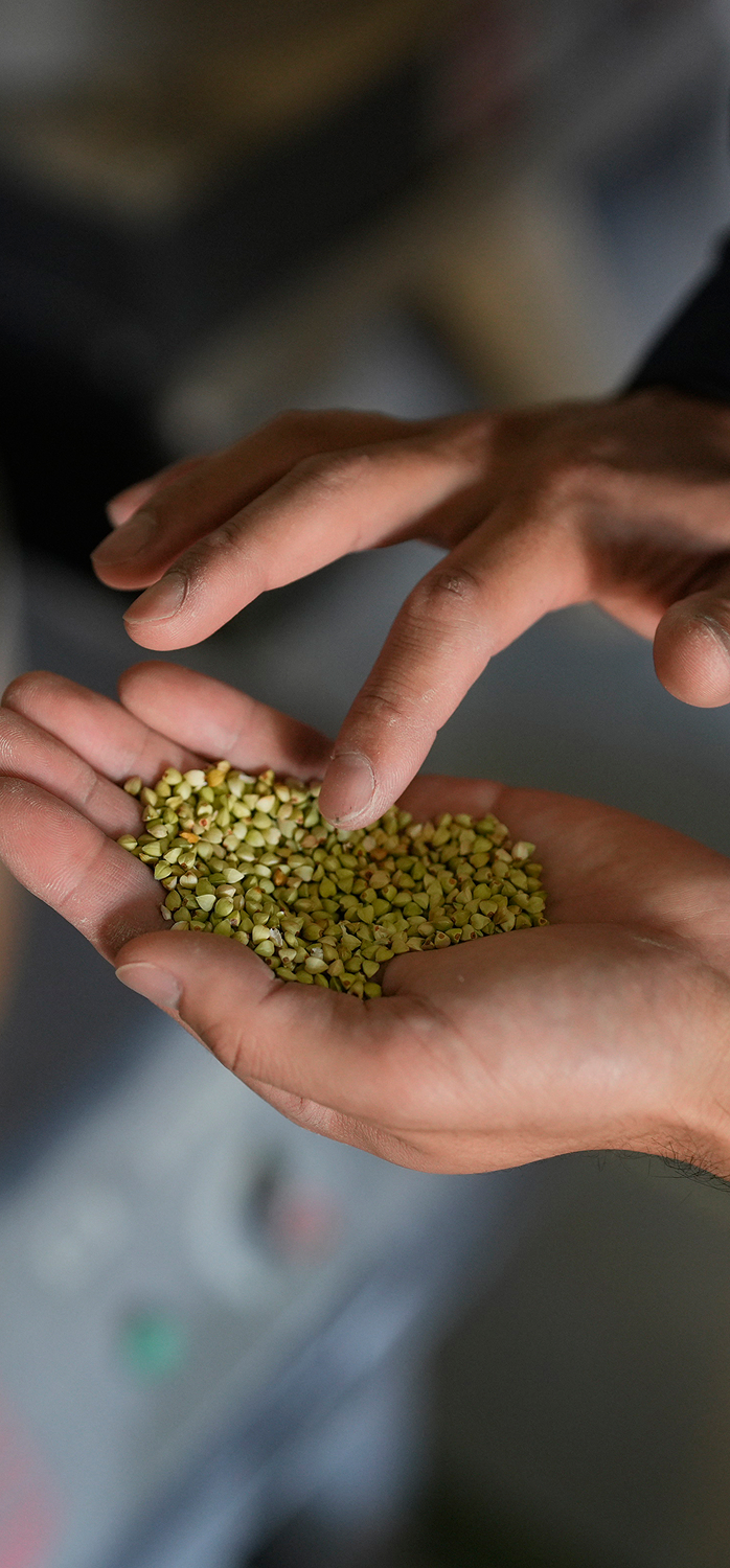 國光社では、可能な限り自分たちの足で産地を訪れ、実際に畑を見て、実を見て、そば材料を仕入れています。取り扱うそばの実はすべて製粉し、そばを打って、目と舌で味と品質を確認。納得できたものだけをお届けします。