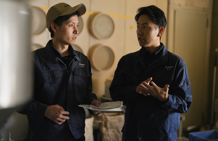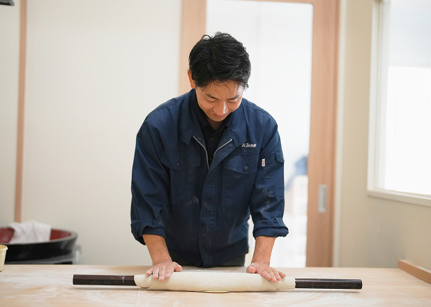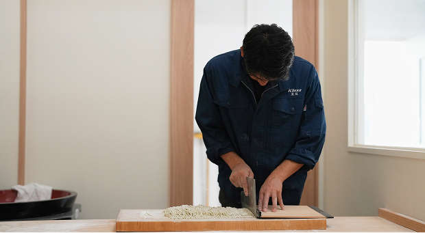 社内にはそば打ち専用キッチンがあり、事業に関わる社員は全員特訓します。どの実がどんな味になるかは、実際に打たなければ分からない。打ち方の提案も体感してこそ。そば愛あふれる社長を筆頭に、日々探求中です!